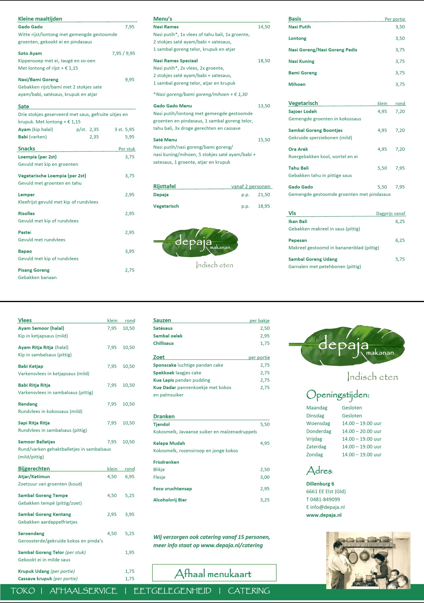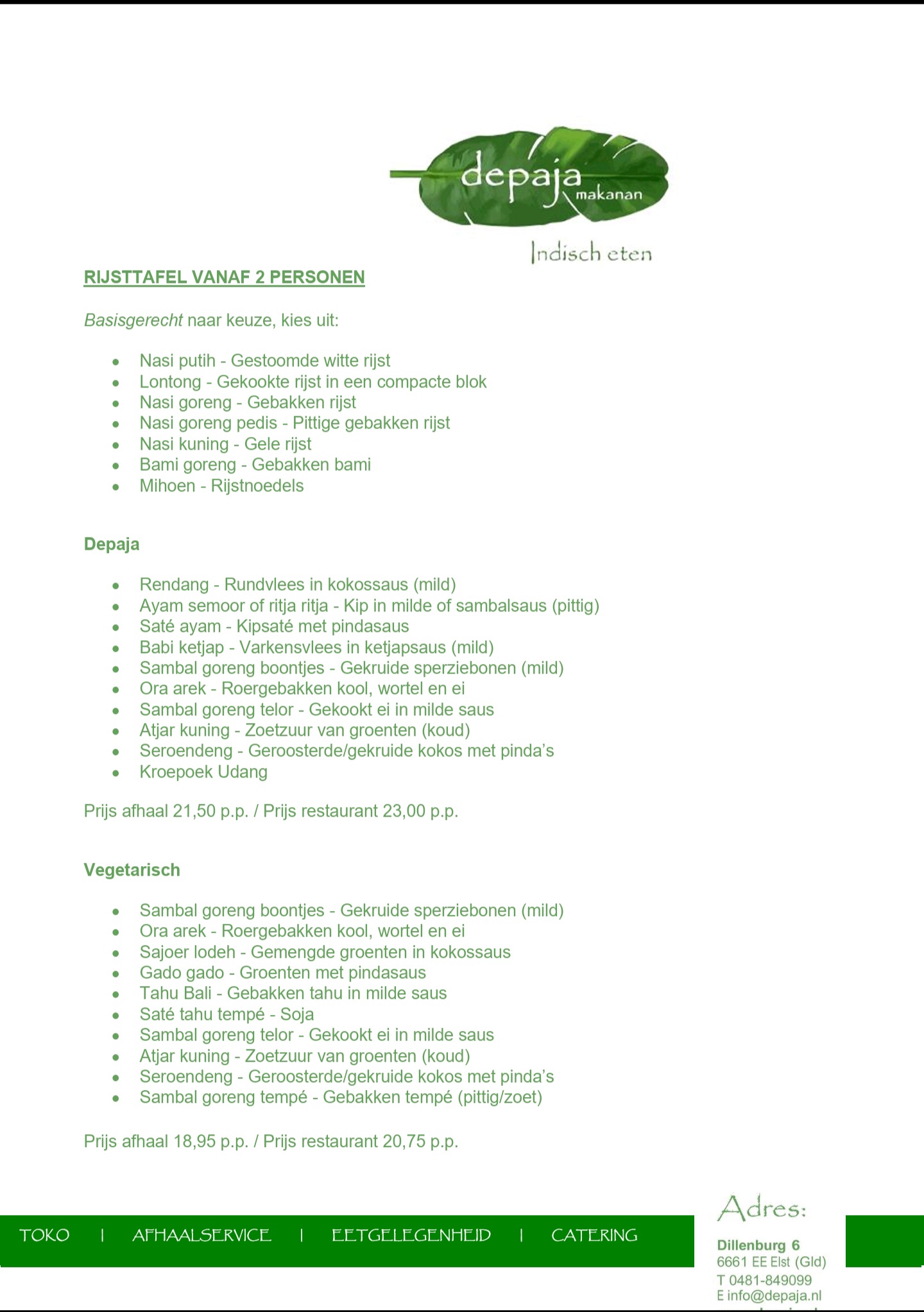 Menukaarten Naast de gerechten op de menukaart zijn er regelmatig Indische specials in de toko te verkrijgen. We kondigen deze meestal online (Facebook en Instagram) aan, maar het komt ook voor dat er spontaan iets buiten de kaart wordt bereid. Afhaal menukaart Restaurant menukaart VoorkantRestaurant menukaart Acterkant Rijsttafel kaart